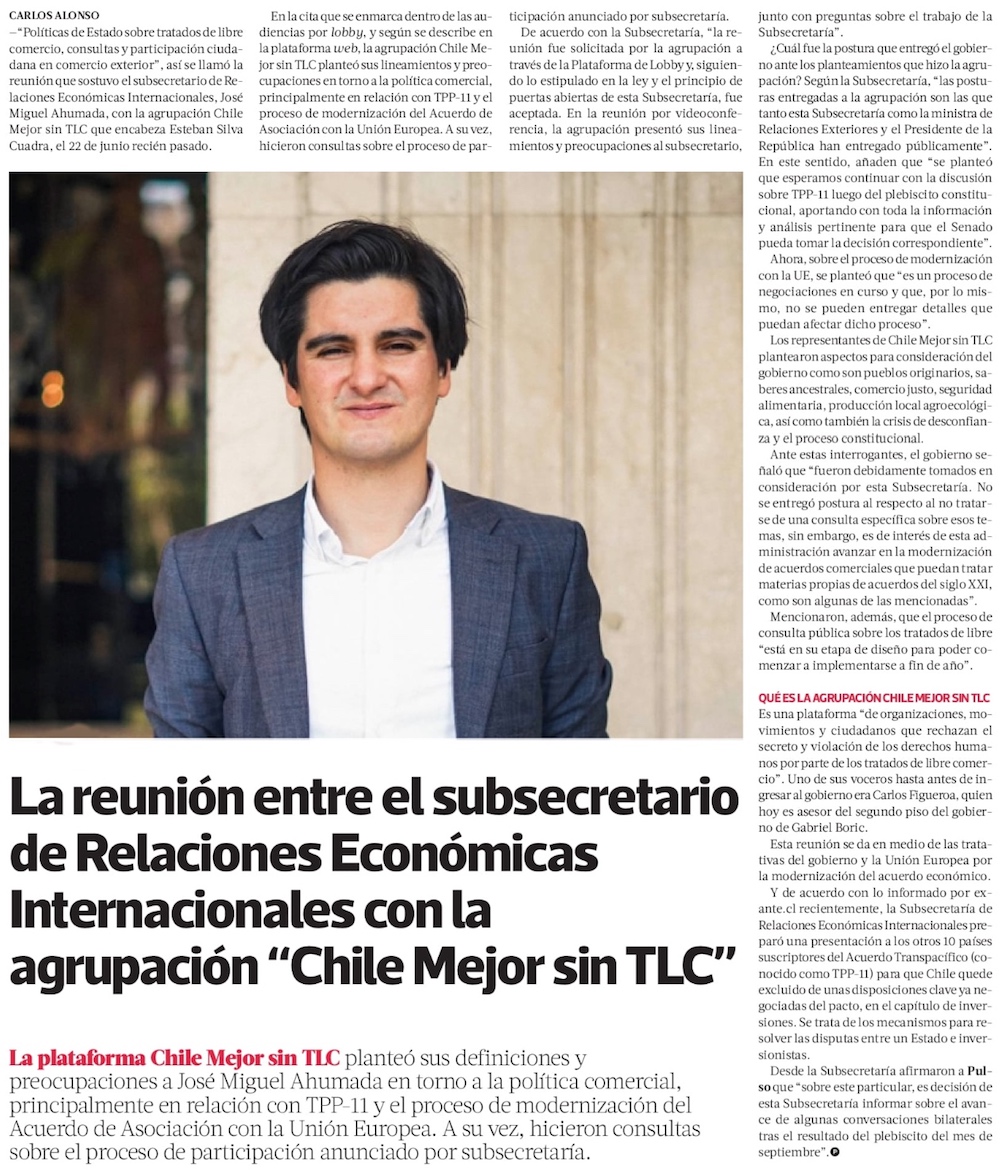Subsecretario Ahumada se reunió con plataforma “Chile Mejor sin TLC” - (El Mercurio de Santiago)