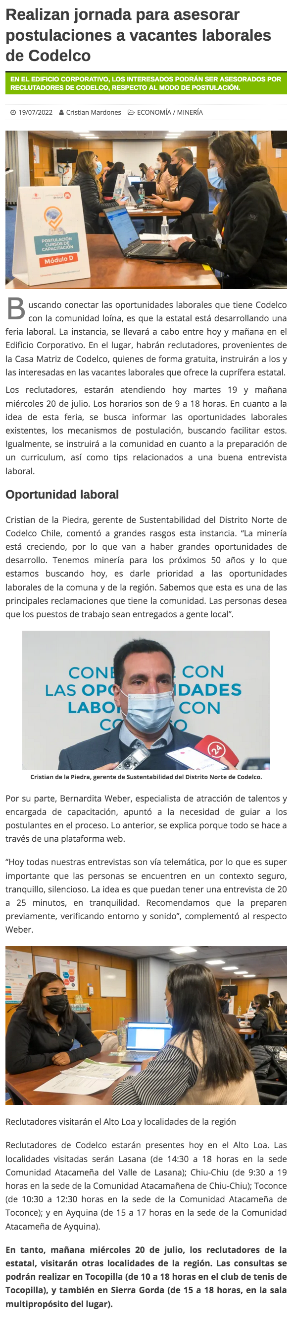 Hasta hoy se extienden las asesorías para postular a vacantes laborales de Codelco - (El Mercurio de Calama)