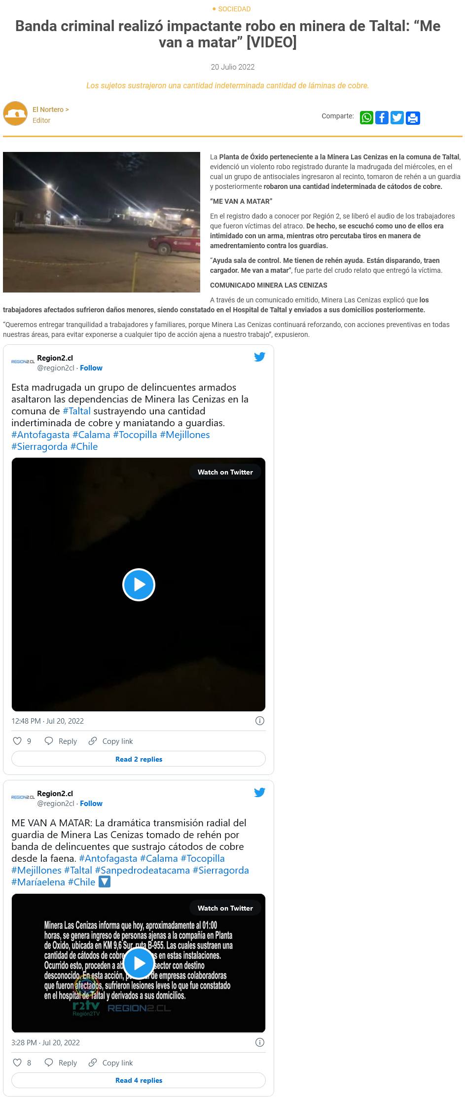 Roban cátodos de cobre de Minera Las Cenizas en Taltal y toman a guardia de rehén - (El Mercurio de Antofagasta)