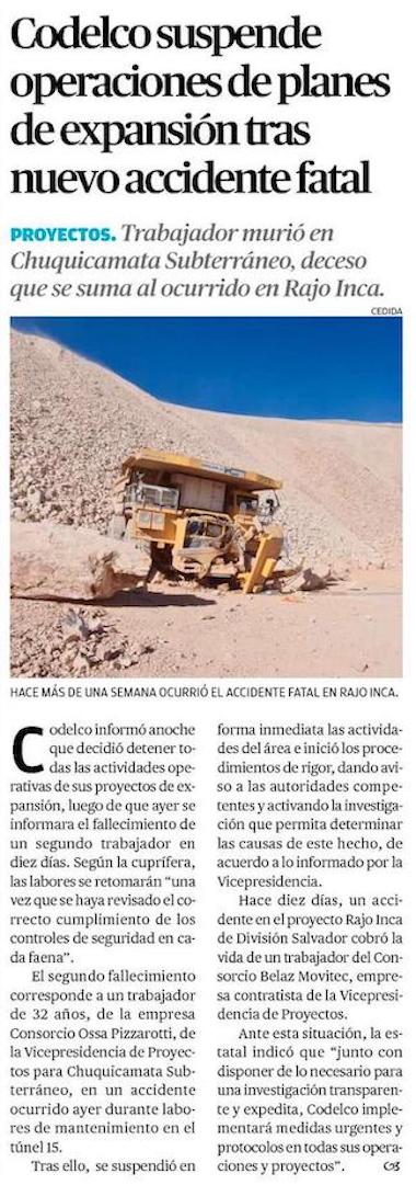 Codelco detiene proyectos ante segundo accidente fatal - (El Mercurio de Santiago)