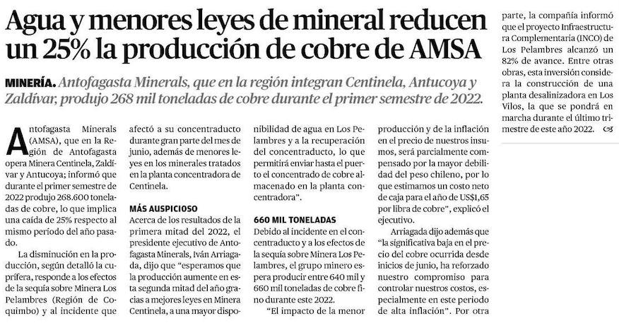 Antofagasta Minerals produjo 268 mil toneladas de cobre en el primer semestre - (La Región)