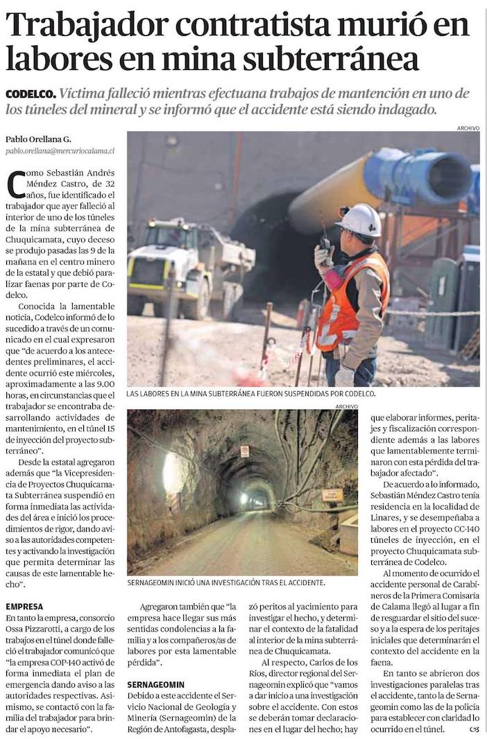 Murió un minero en la faena de Chuquicamata de Codelco - (cooperativa online)