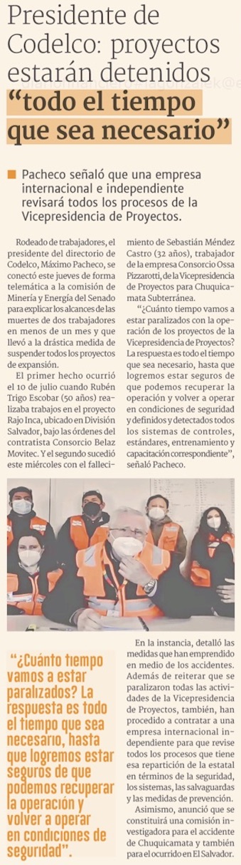 Codelco detiene Chuqui Subterránea, Tranque Talabre y RT Óxidos tras último accidente fatal - (El Mercurio de Antofagasta)