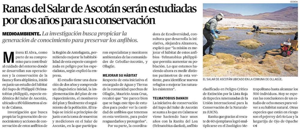 Sapos endémicos del Salar de Acotán serán estudiados por dos años para su conservación - (El Mercurio de Calama)
