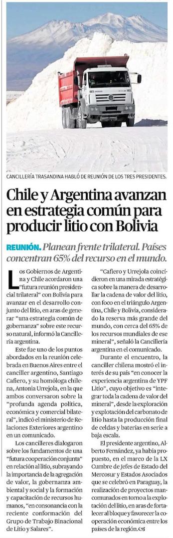 Chile y Argentina avanzan en estrategia común para producir litio con Bolivia - (El Mercurio de Calama)