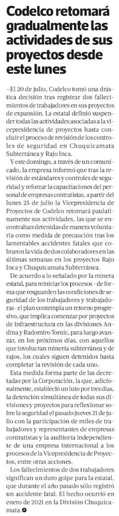 A partir de hoy Codelco retoma de forma gradual las actividades de sus proyectos - (El Mercurio de Antofagasta)
