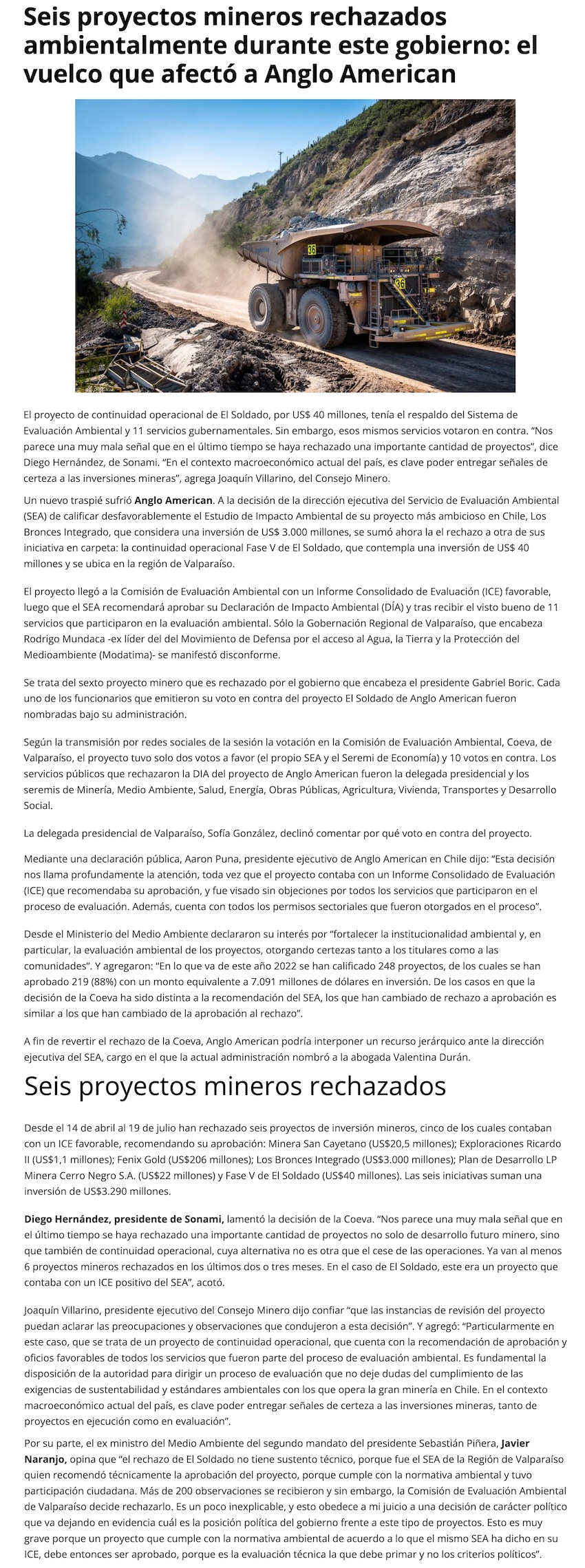 Seis proyectos mineros rechazados ambientalmente durante este gobierno: el vuelco que afectó a Anglo American - (eldiariodesantiago.cl)