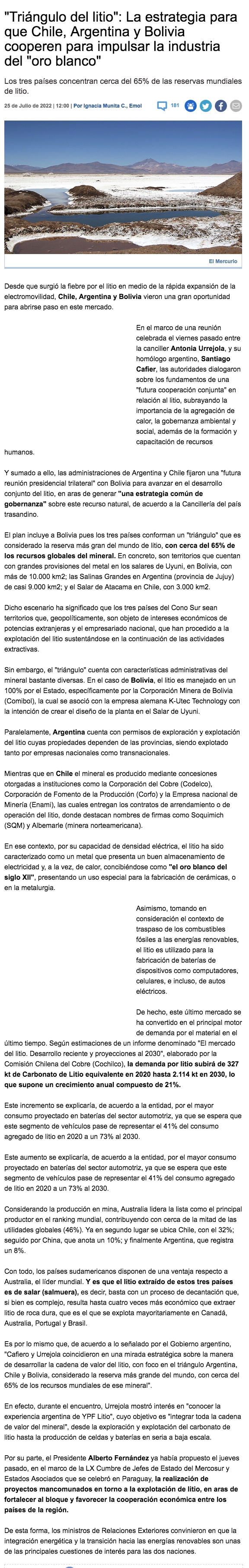 Triángulo del Litio: Chile y Argentina anuncian reunión con Bolivia para avanzar en producción conjunta - (americaeconomia online)