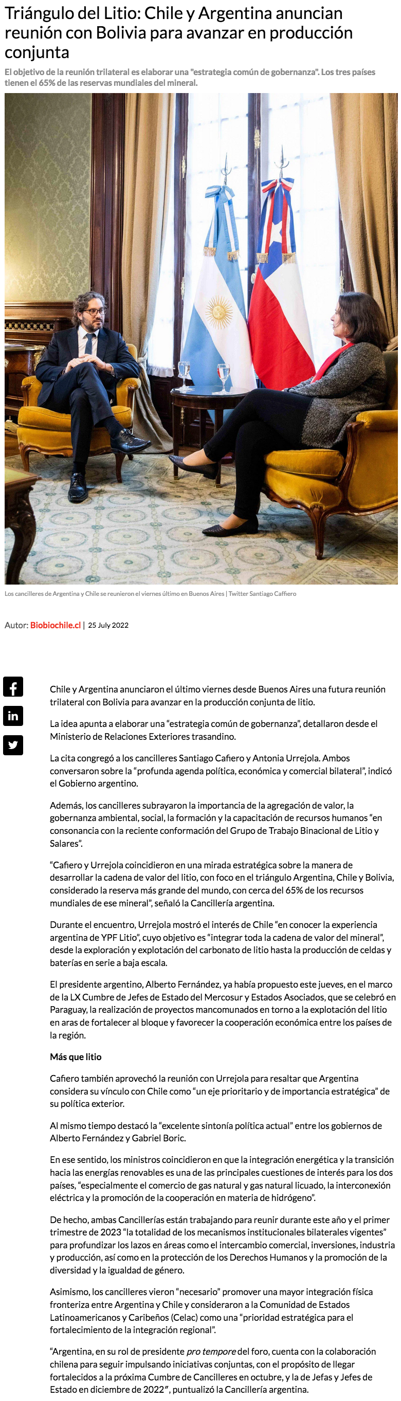 ¿Una OPEP del litio? Argetina y Chile invitará a Bolivia a crear nueva gobernanza para explorar el mineral - (Diario Financiero)