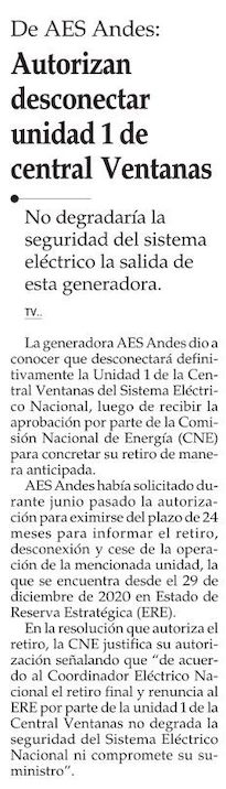 AES Andes desconectará anticipadamente termoeléctrica - (El Mercurio de Valparaíso)