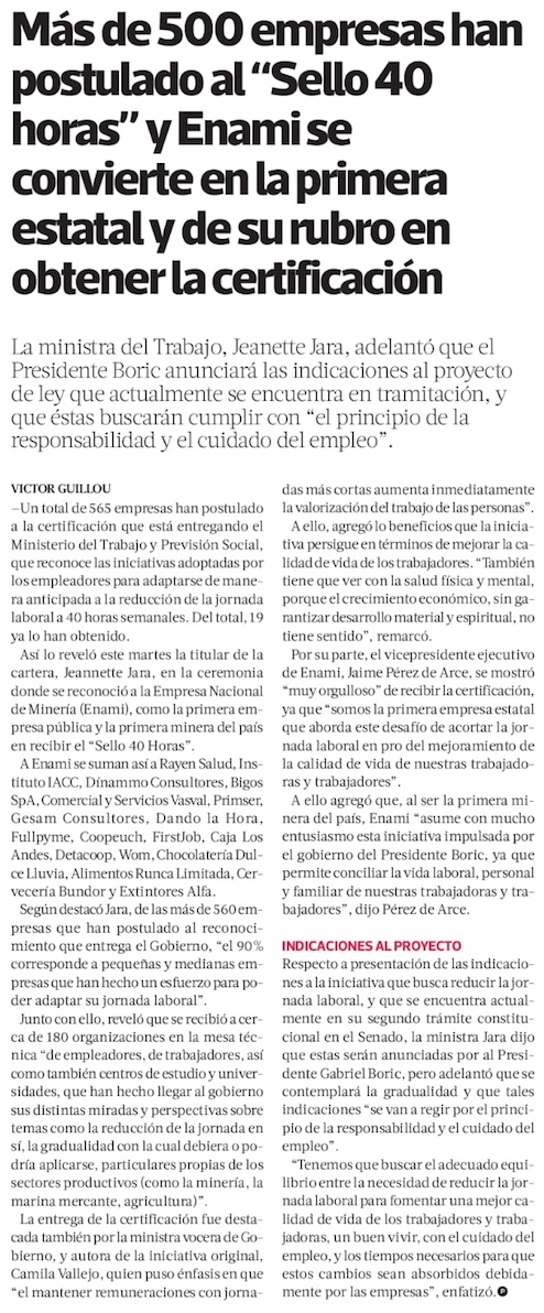 Enami es la primera estatal en conseguir sello “40 horas” - (El Mercurio de Santiago)