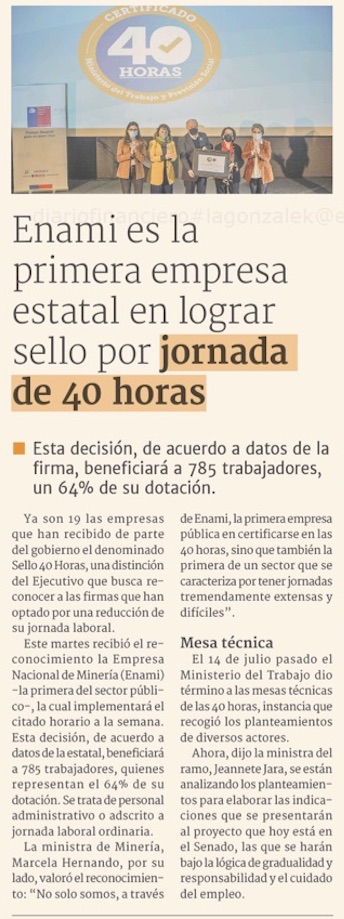 Enami es la primera estatal en conseguir sello “40 horas” - (El Mercurio de Santiago)