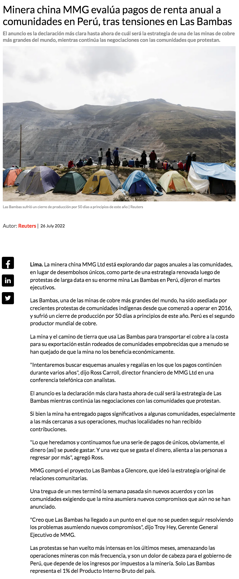 Perú: China MMG explora pagos anuales a comunidades de Las Bambas - (Diario Financiero)