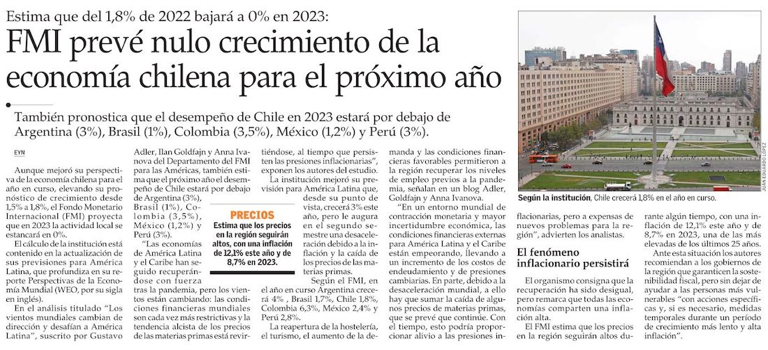 FMI prevé que el PIB de Chile no crecerá en 2023 y será la economía de peor desempeño entre principales de la región - (Pulso)