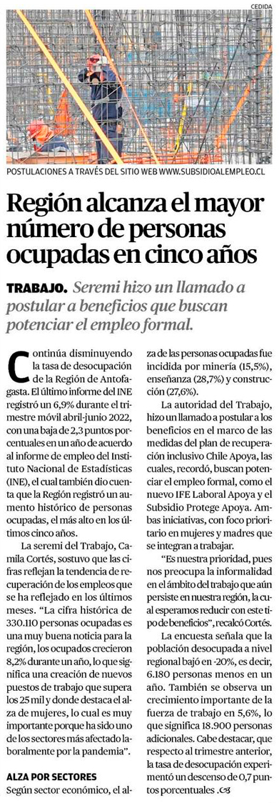 Número de personas ocupadas supera los 330 mil en la Región de Antofagasta - (El Mercurio de Calama)