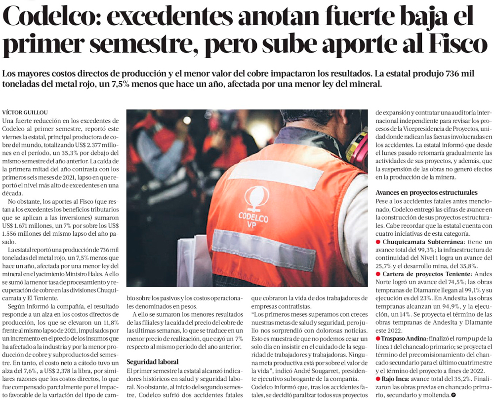 Dura caída de excedentes de Codelco en 1° semestre, aunque aportes al fisco crecieron - (La Segunda)