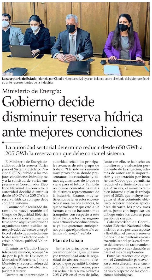 Ministerio de Energía flexibiliza reserva hídrica y aún no define extensión del decreto de racionamiento - (Diario Financiero)