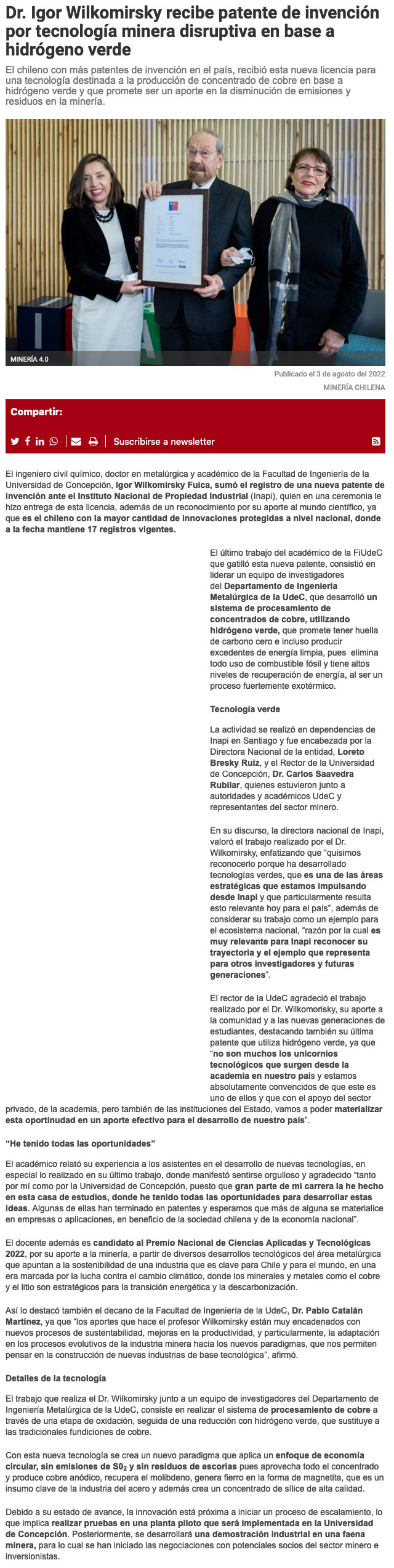 Dr. Igor Wilkomirsky recibe patente de invención por tecnología minera disruptiva en base a hidrógeno verde - (Diario Concepción)