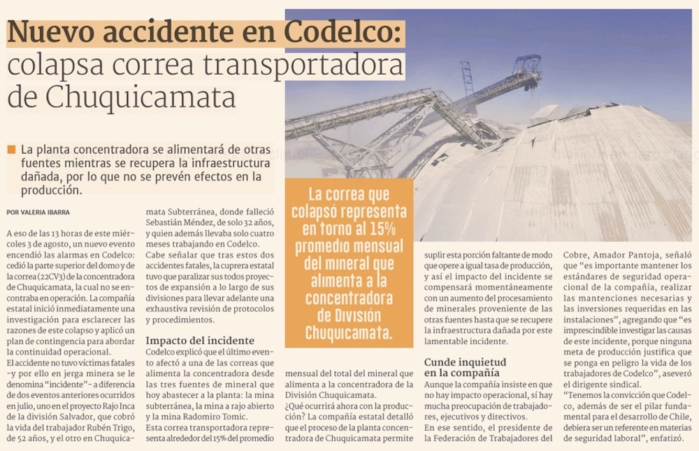 Domo y correa colapsan en Chuqui e inician investigación para determinar los motivos - (El Mercurio de Calama)