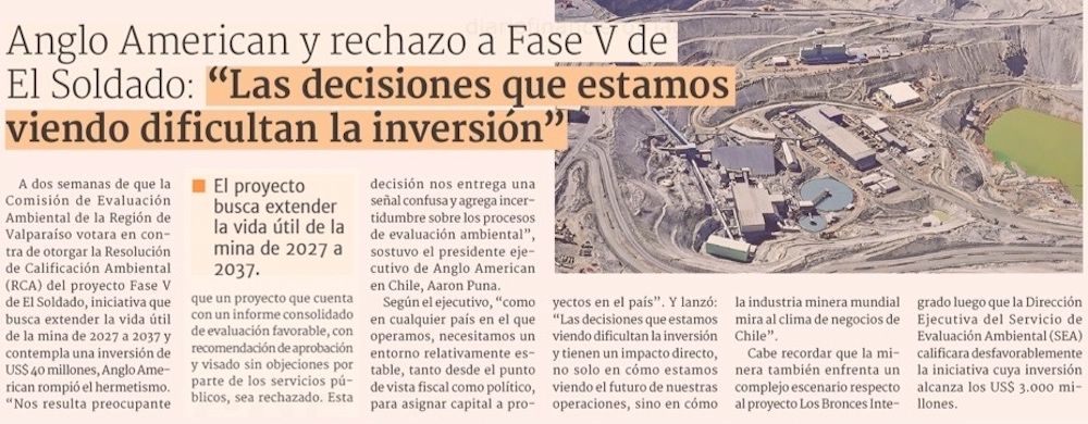 Anglo American critica decisión de rechazar ampliación de El Soldado - (Pulso)