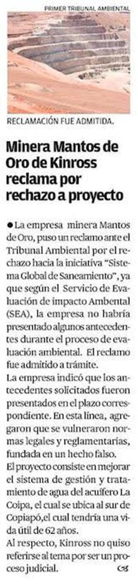 Minera Mantos de Oro reclama ante Primer Tribunal Ambiental por rechazo de proyecto "Sistema Global de Saneamiento" - (atacamanoticias)