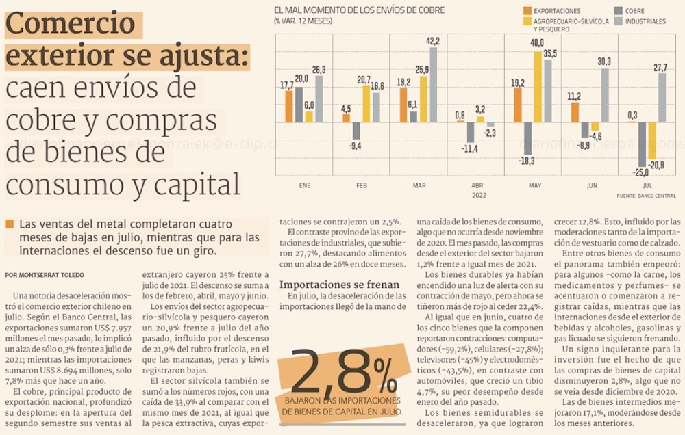 Exportaciones de cobre registraron en julio su mayor caída desde inicios de 2016 - (Pulso)