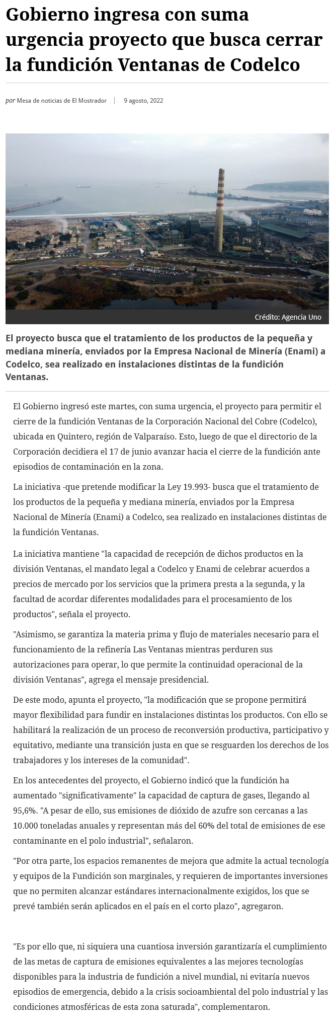 Gobierno ingresa proyecto para concretar cierre de la fundición - (El Mercurio de Valparaíso)