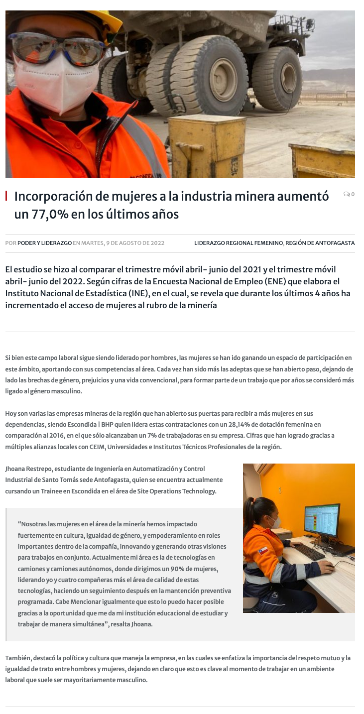 En los últimos años aumentó un 77% la incorporación de la mujer en la minería - (Estrella de Antofagasta)