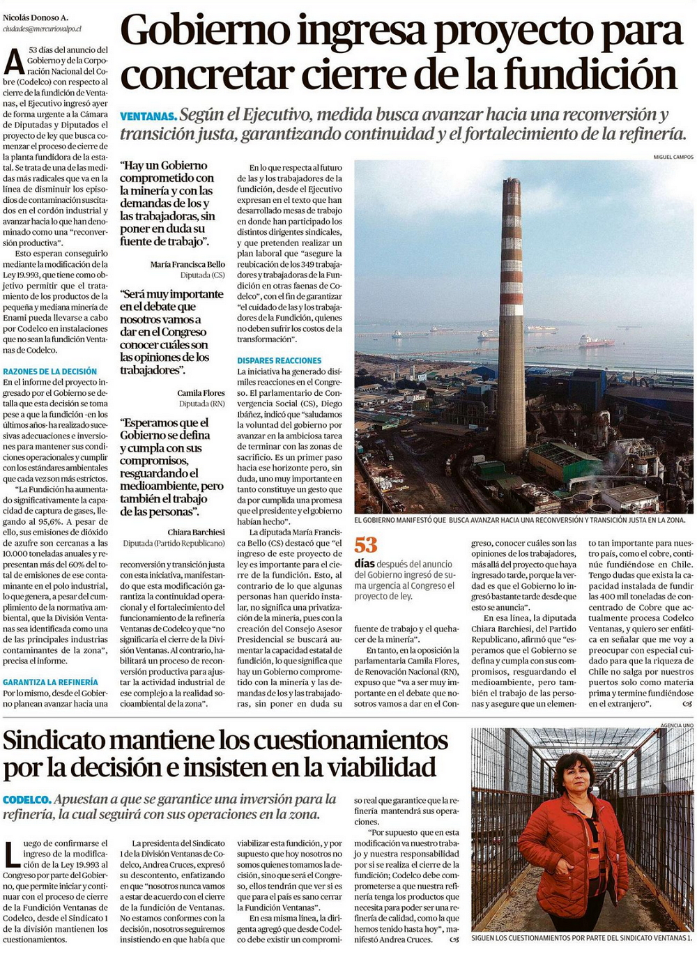 Ingresan proyecto que posibilita cierre de Ventanas - (El Mercurio de Santiago)