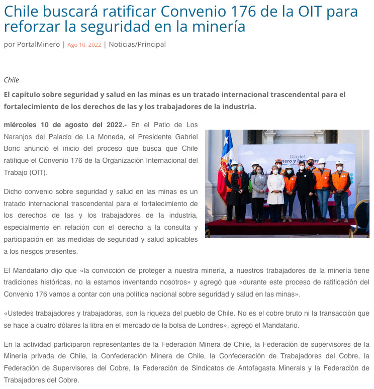 Gobierno buscará ratificar tratado OIT para reforzar salud y seguridad de trabajadores mineros - (induambiente.cl)