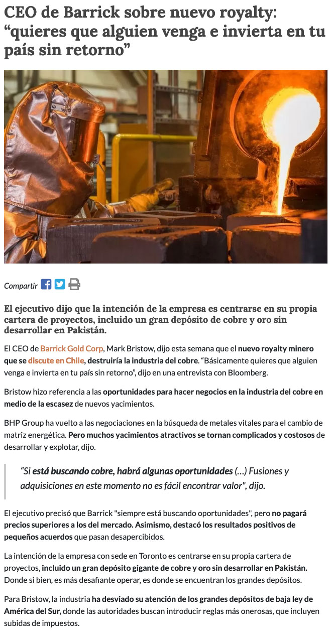 CEO de Barrick dice que el nuevo royalty en Chile "destruye la industria del cobre” - (Diario Financiero)