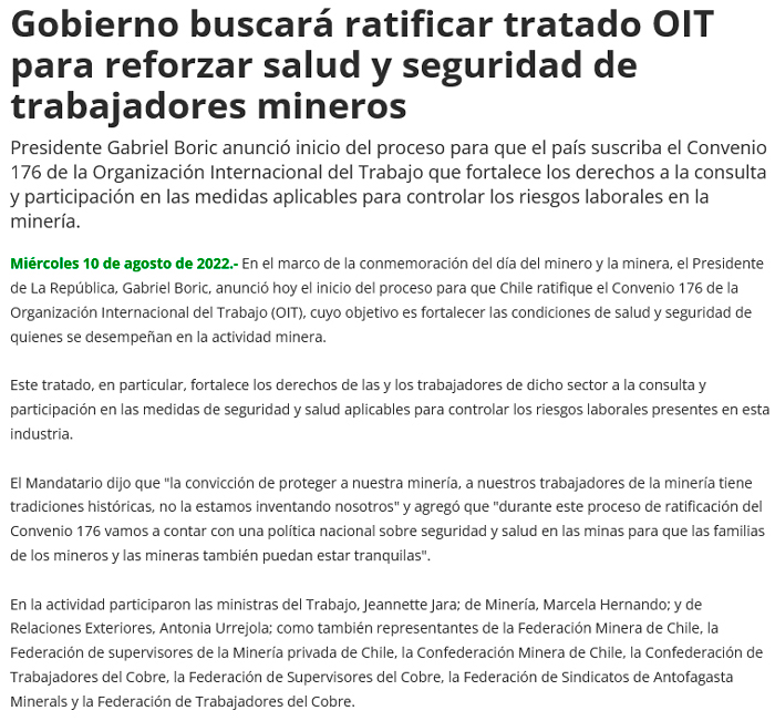 Chile buscará ratificar Convenio 176 de la OIT para reforzar la seguridad en la minería - (portalminero)