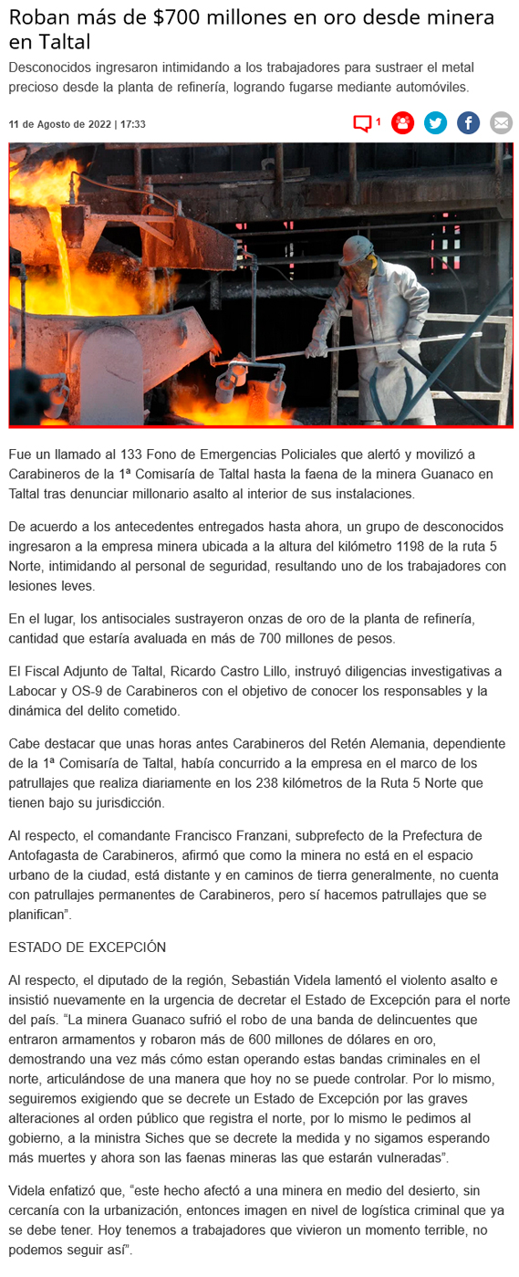 Banda roba oro avaluado en $700 millones en asalto armado a mina en Taltal - (El Mercurio de Santiago)