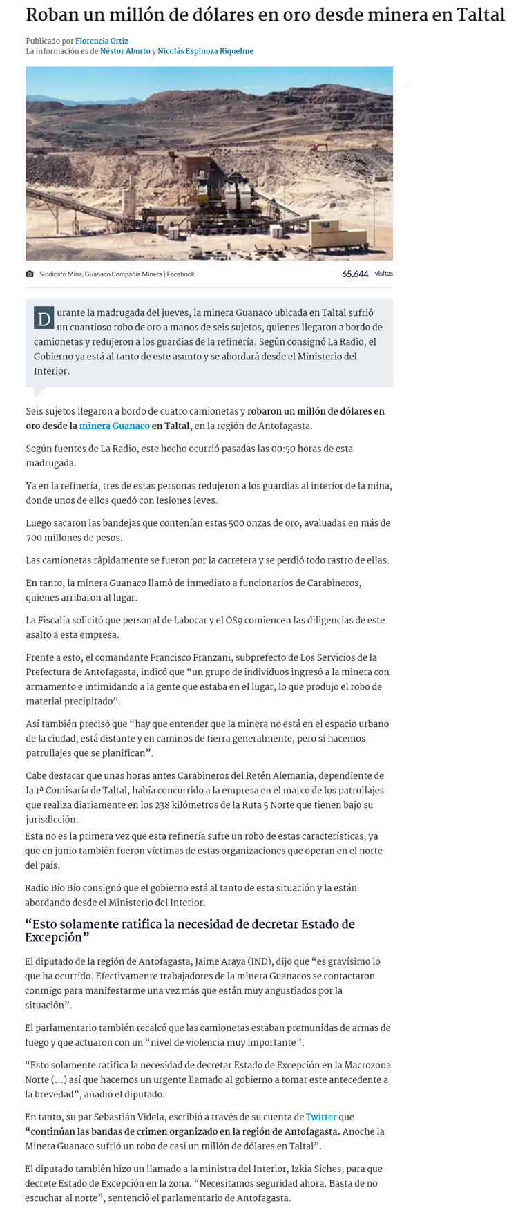 Grupo armado roba $700 millones en oro desde Minera Guanaco - (Las Últimas Noticias)