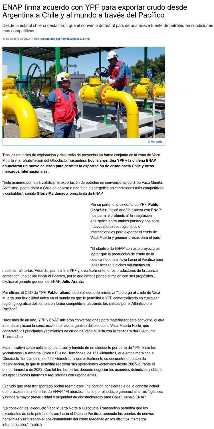 Enap acuerda importar petróleo desde Vaca Muerta - (El Mercurio de Santiago)