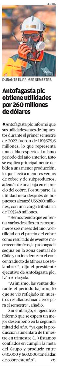 Antofagasta plc obtiene utilidades antes de impuestos por US$679,6 millones en el primer semestre - (mch.cl)