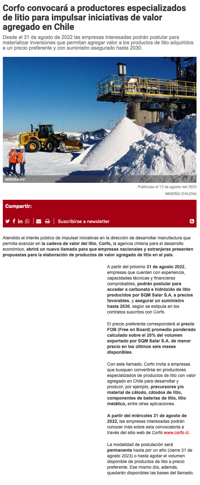 Corfo lanzará convocatoria para agregar valor a industria del litio - (El Mercurio de Calama)