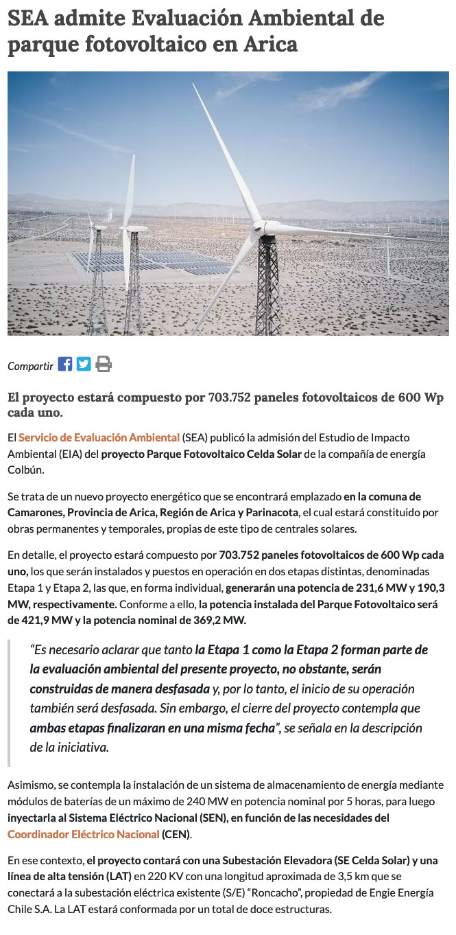 Colbún ingresa a evaluación ambiental proyecto de energía solar en la Región de Arica - (Pulso)