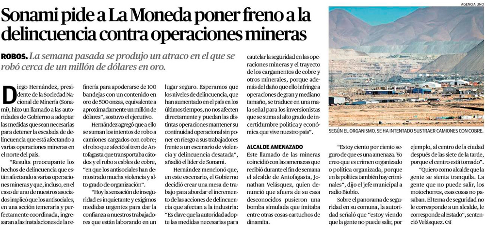 Sonami pide intervención del Gobierno ante aumento de robos - (El Mercurio de Santiago)