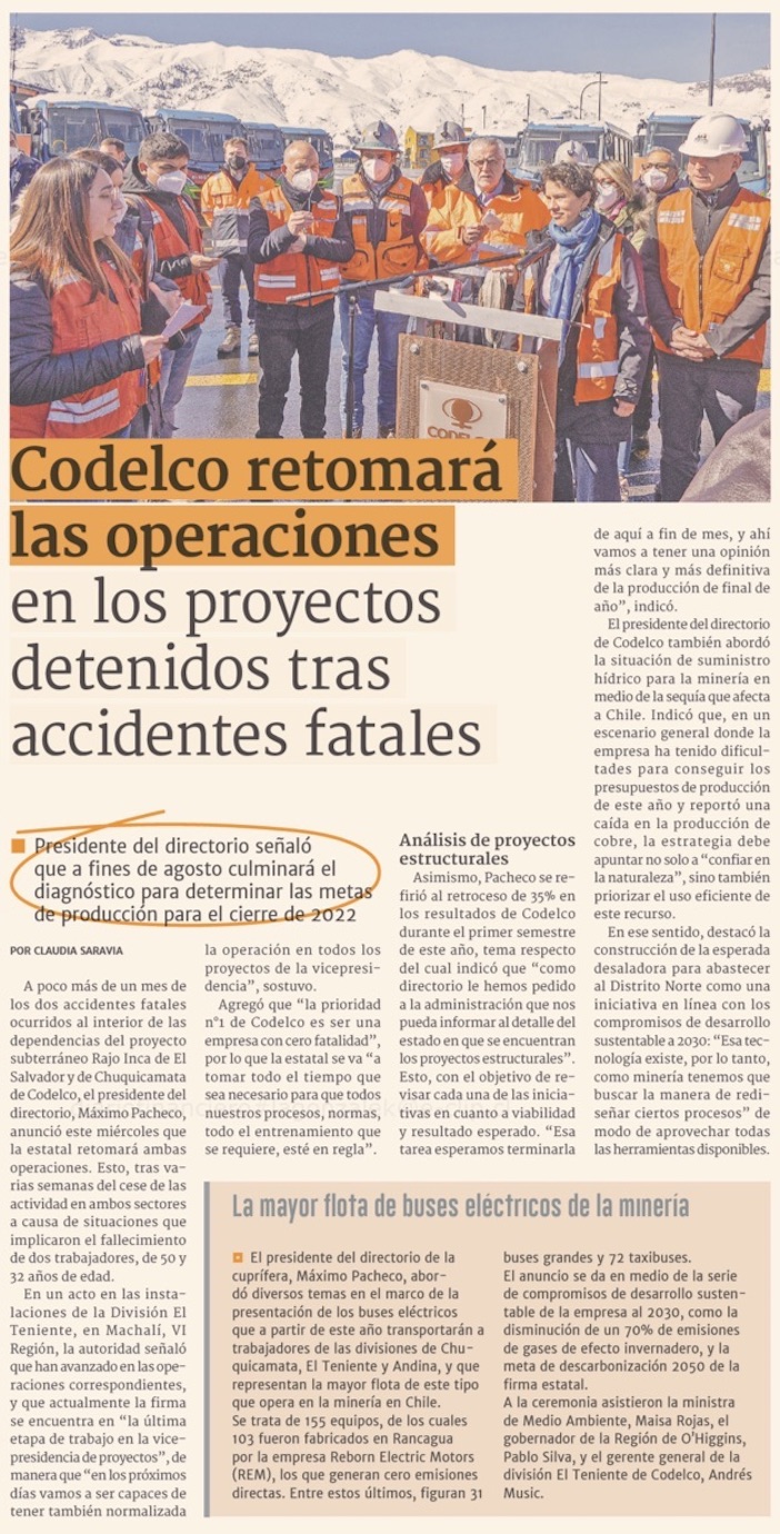 Codelco revisará proyectos estructurales por posibles desviaciones de metas productivas - (El Mercurio de Santiago)