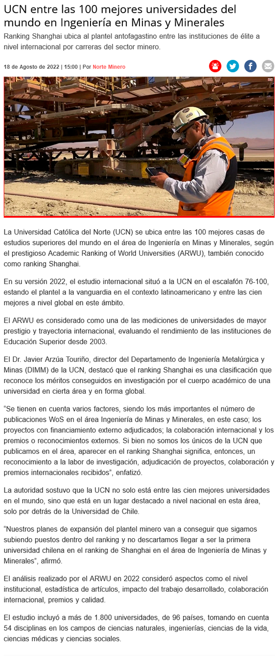 UCN entre las 100 mejores universidades en Ingeniería en Minas - (El Mercurio de Antofagasta)