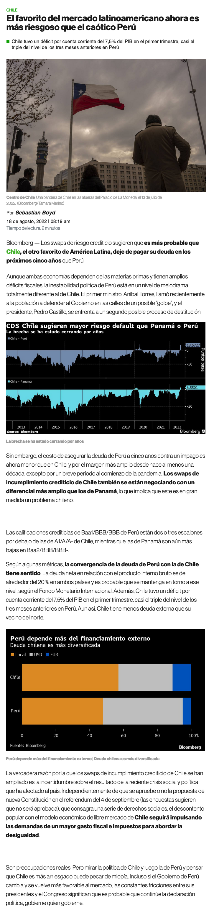 Bloomberg publica que para mercado Chile podría ser más riesgoso que Perú y alude a deuda - (biobiochile online)