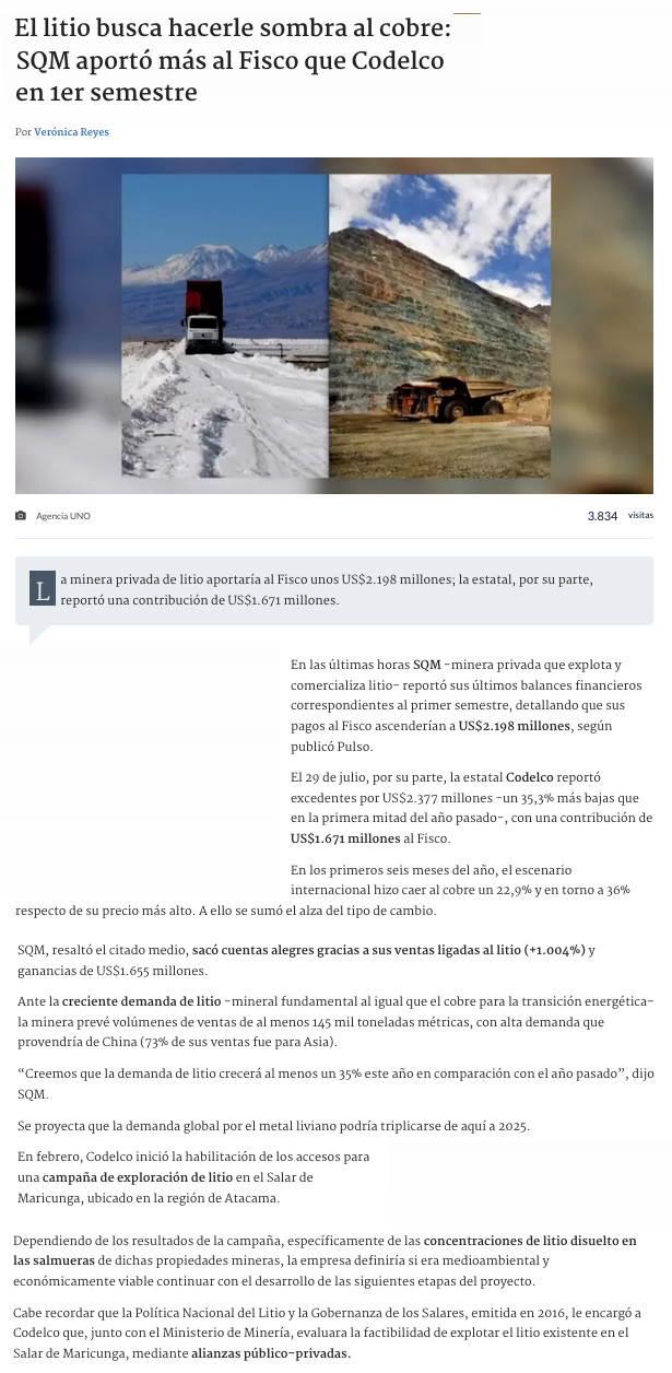 SQM versus Codelco: el litio "privado" pagó al Fisco más que el cobre estatal en el primer semestre - (Pulso)
