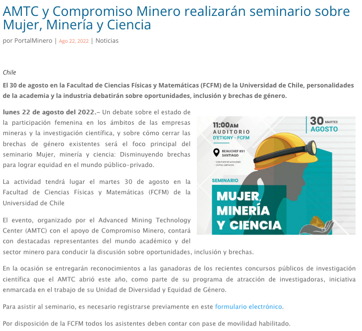 AMTC y Compromiso Minero realizarán seminario sobre mujer, minería y ciencia - (mch.cl)