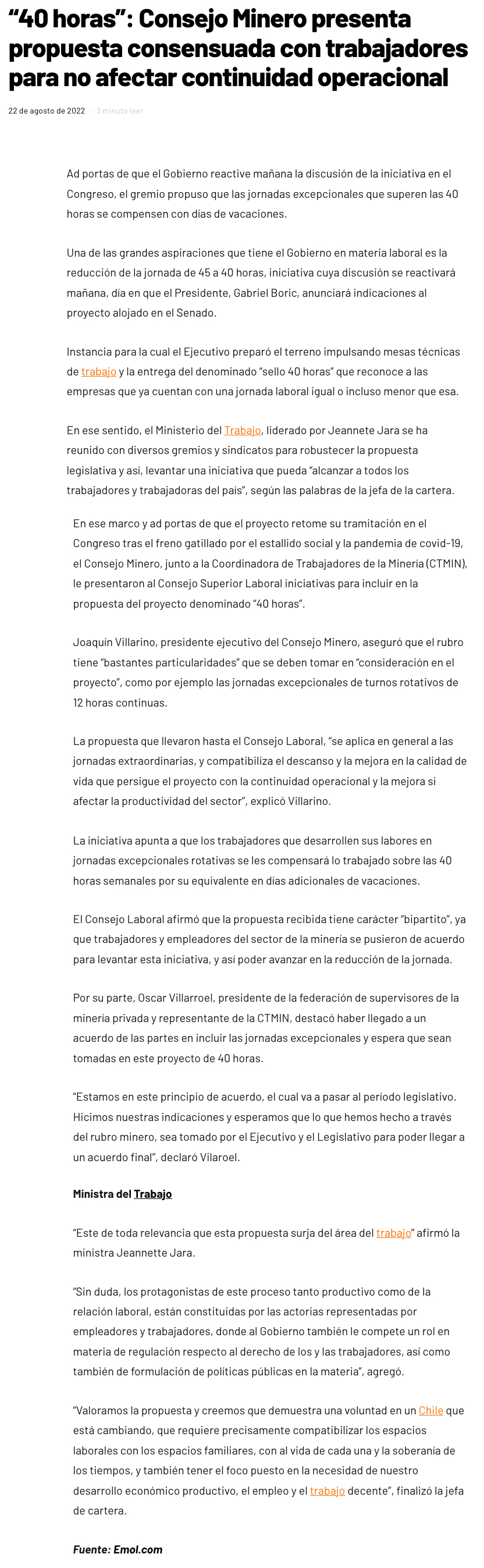 Consejo Minero y trabajadores del cobre presentan proyecto para reducir jornada laboral a 40 horas - (atacamanoticias)