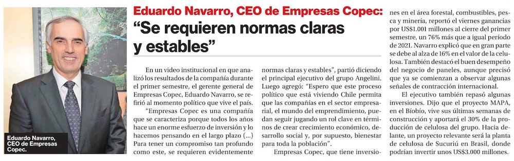 Empresas Copec busca invertir en energía y dice que MAPA vive fase final de construcción - (El Mercurio de Santiago)
