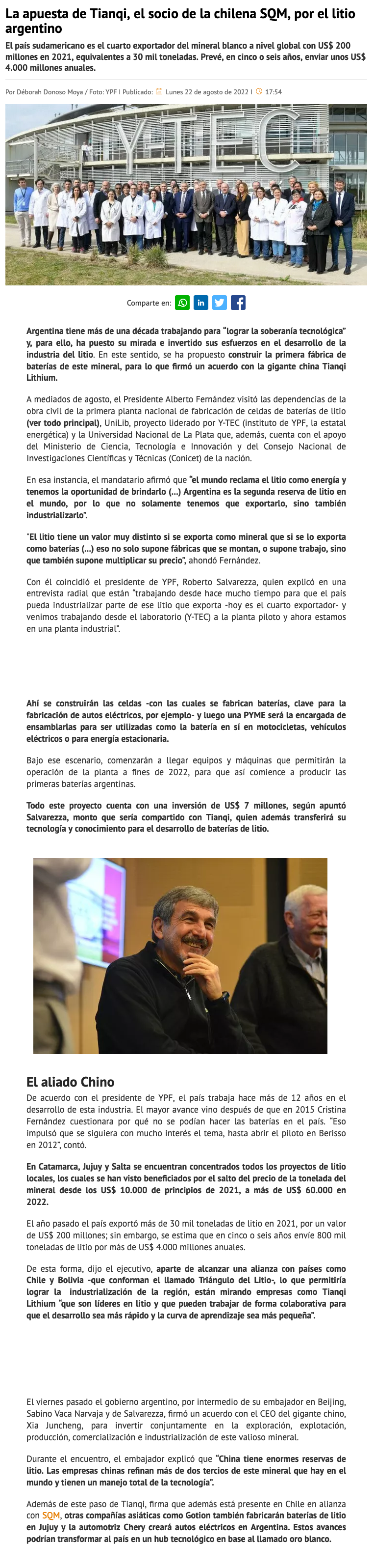 Argentina y socia china de SQM firman acuerdo para construir la primera fábrica de baterías de litio en ese país - (Diario Financiero)