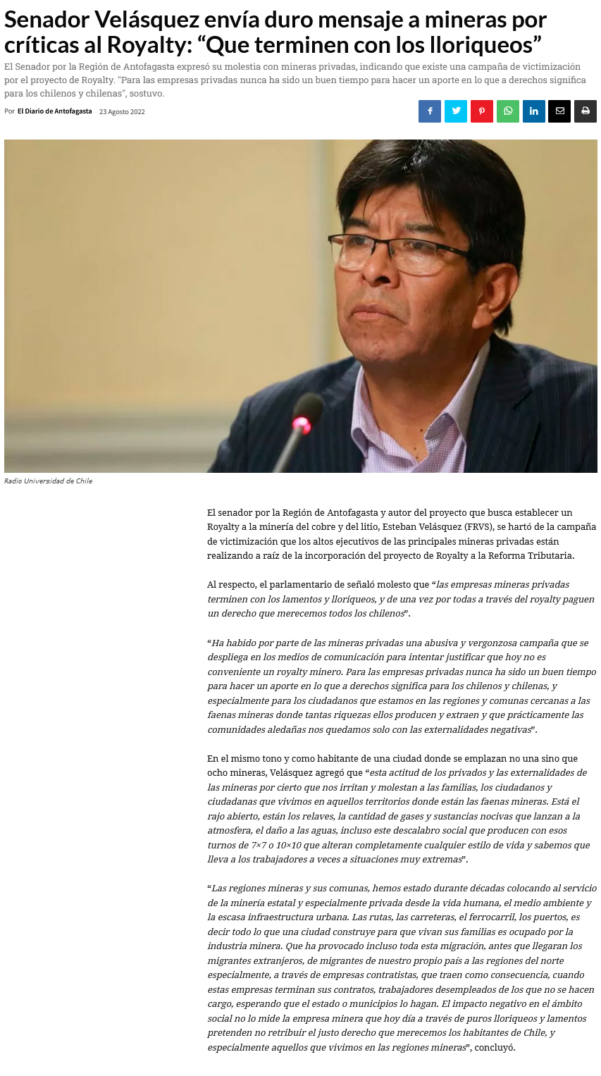 Senador Velásquez por postura de mineras: “Los lloriqueos y lamentos no se condicen con las ganancias que se han llevado de nuestro país” - (radio.uchile online)