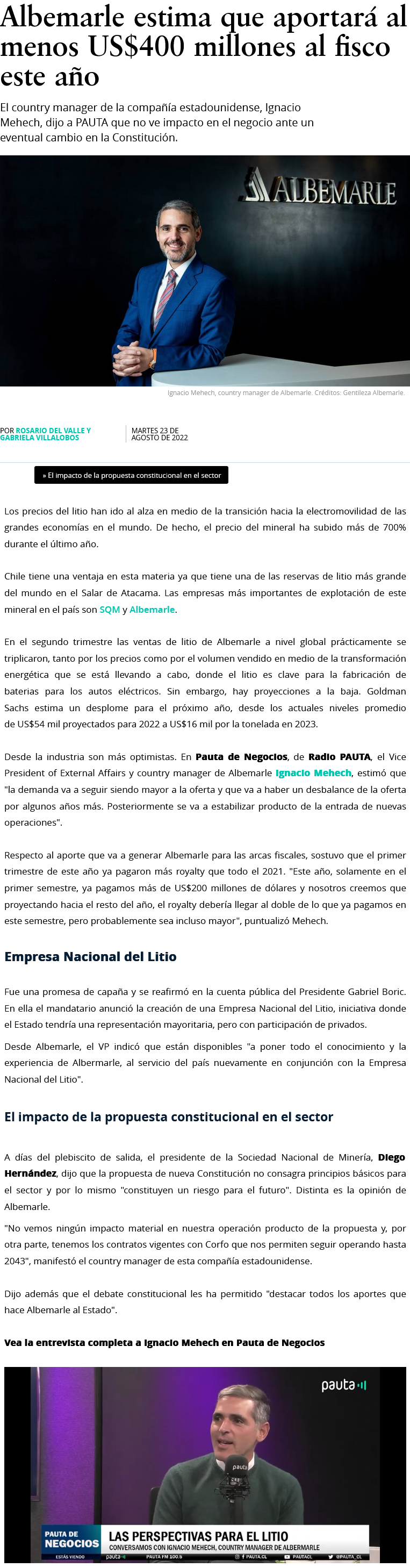 Gigante del litio Albemarle prevé duplicar su aporte a Corfo en el segundo semestre de 2022 - (Pulso)