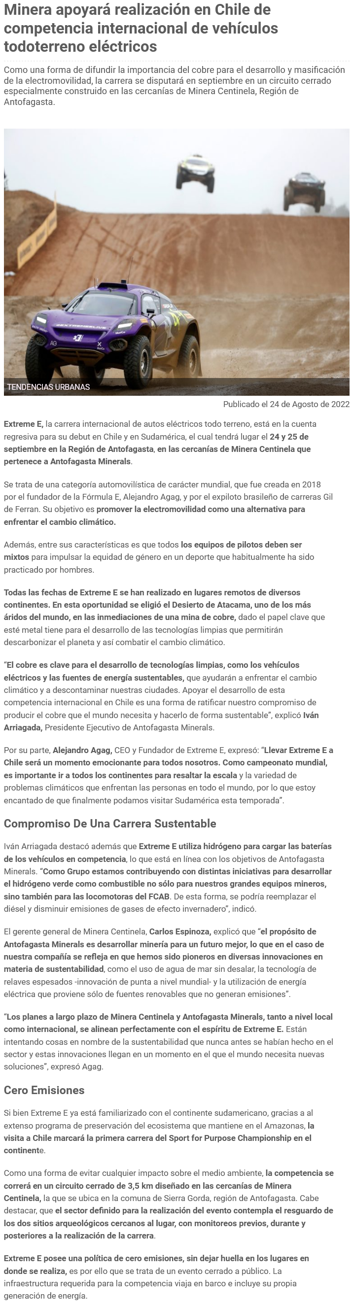 Antofagasta Minerals apoyará realización en Chile de competencia internacional de vehículos todoterreno eléctricos - (mch.cl)
